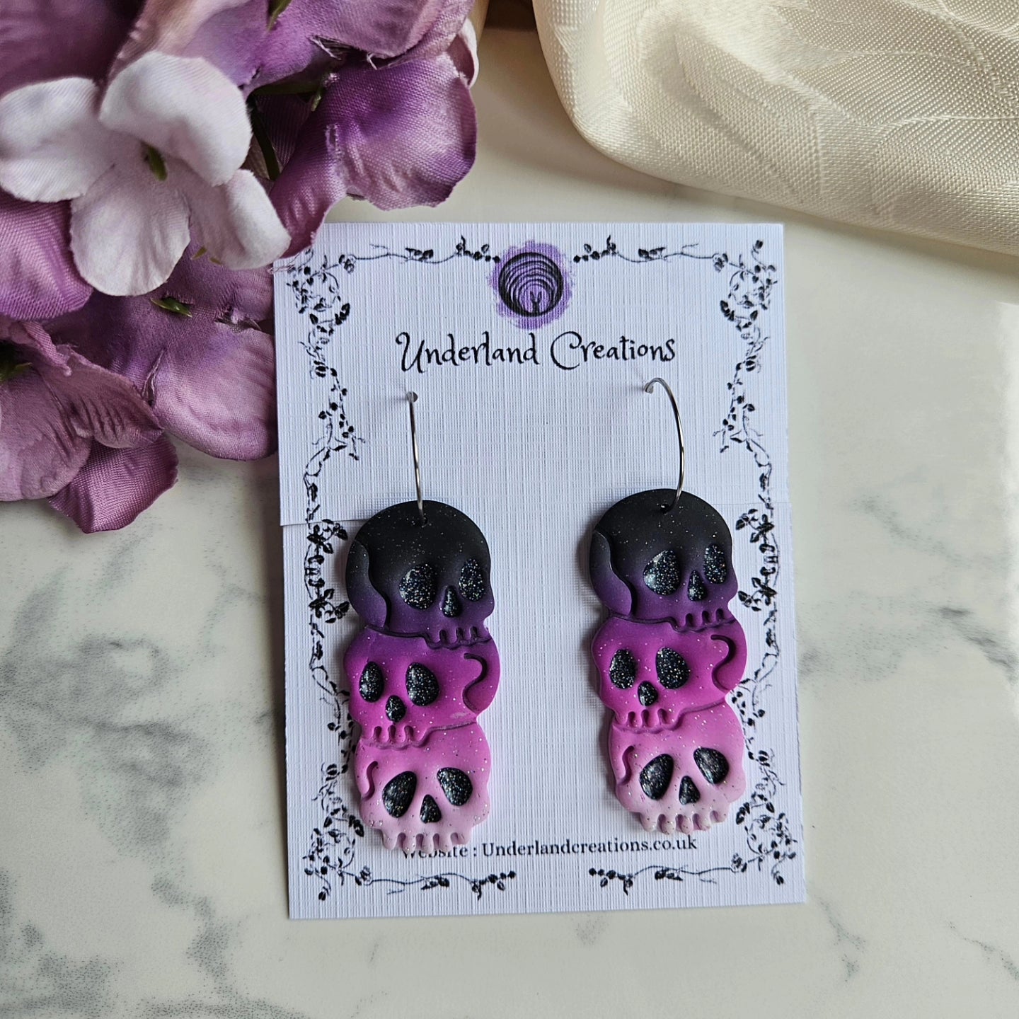 Welcome to the new era of Underland Creations, where you can find all things fantastical, magical, and a wee bit gothic! These Triple skulls are perfect for that gothic vibe, and come in a variety of colours with a little bit of added sparkle (because who doesn't like a little bit of glitter in their accessories?).